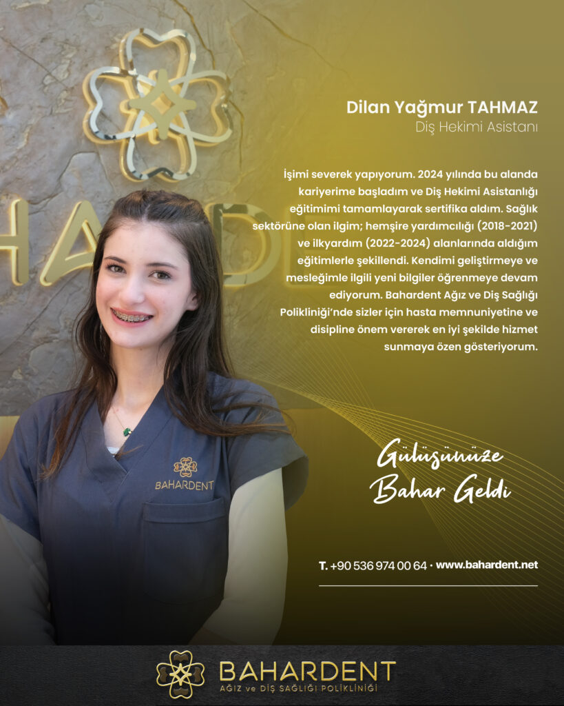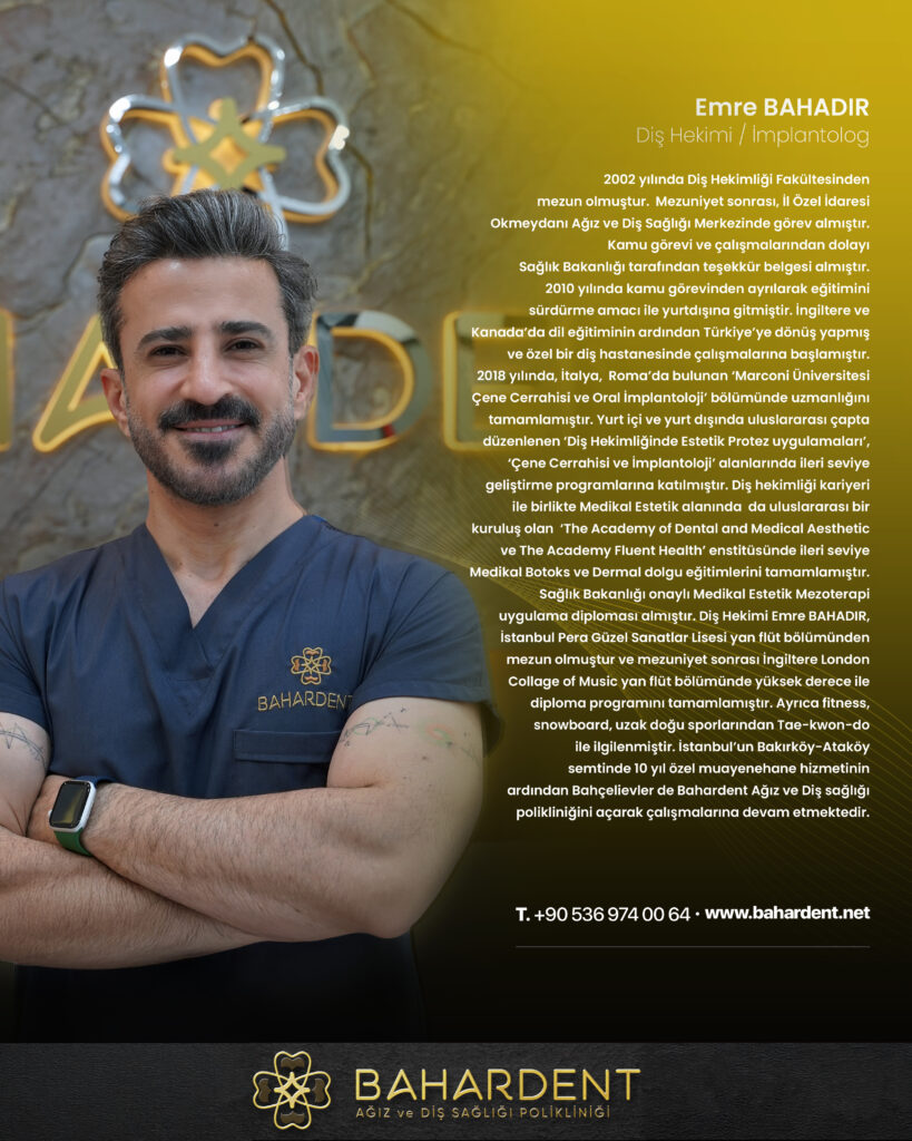 Dr. Emre Bahadır, tüm bu bilgi birikimi ve tecrübesini şimdi BaharDent kliniğinde hastalarına sunmaktadır. BaharDent olarak, sizlere modern ve güncel tedavi yaklaşımlarıyla, estetik ve fonksiyonel açıdan en iyi hizmeti vermeyi hedefliyoruz.